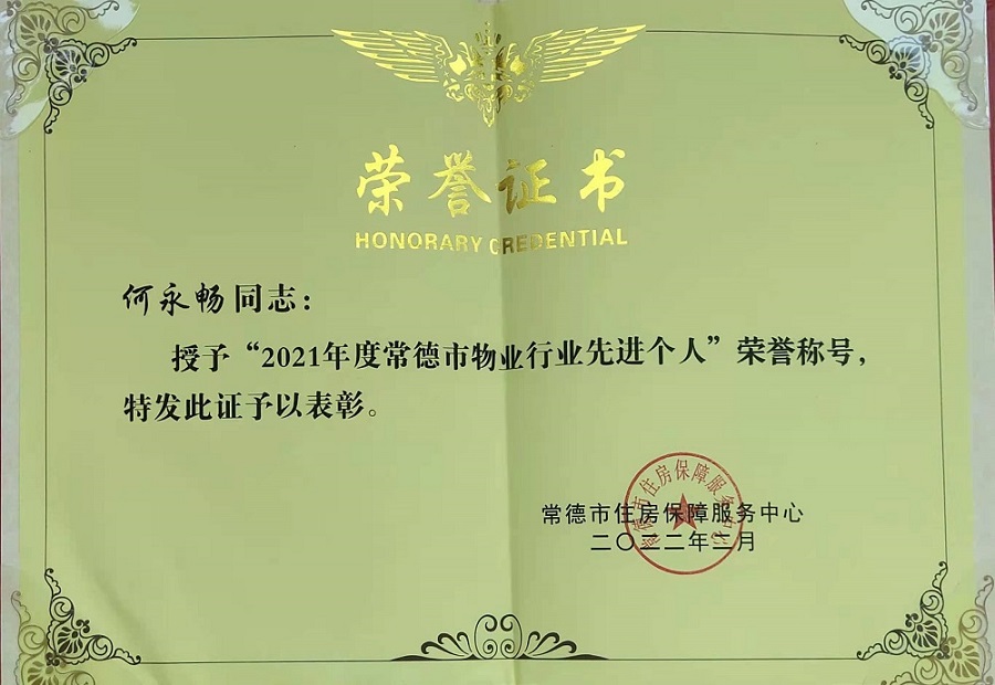 常德市康都物業(yè)服務(wù)有限公司被評(píng)為2021年度常德市優(yōu)秀物業(yè)服務(wù)企業(yè)、公司法人及員工被評(píng)為2021年度常德市物業(yè)行業(yè)先進(jìn)個(gè)人的表彰。